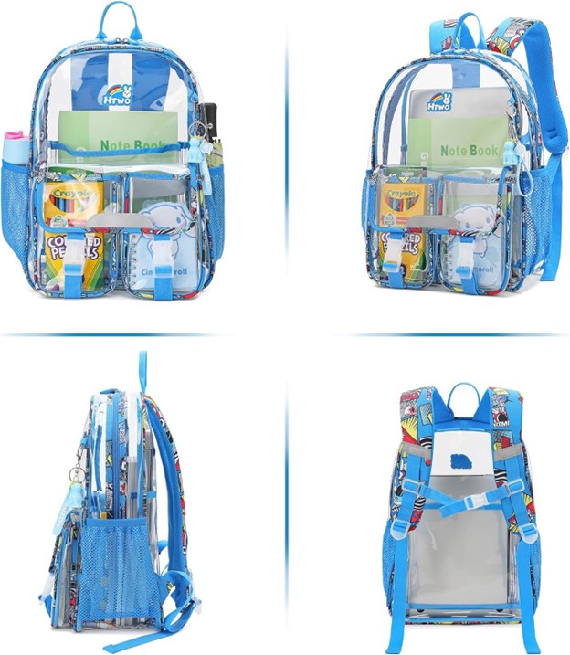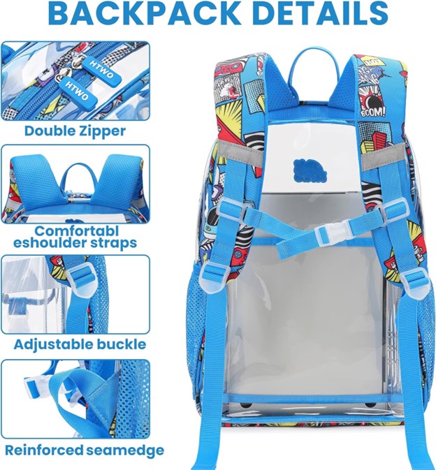 DETAILS: The clear book bags sewing adopts triangular reinforcement technology to improve its service life. Multiple locations are equipped with high brightness reflective strips to improve visibility in low light environments of the see through backpack. In addition, the colorful patterns on the sides and shoulder straps make it easier for you to be recognized in the crowd.