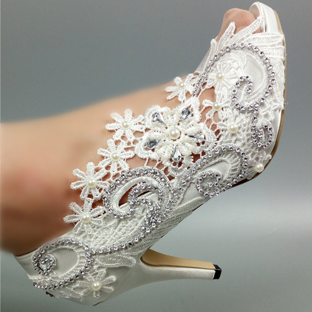 Women Lace Flower Spike Heel Beaded Peep Toe Slip-On Pumps Shoes For Weddings and Parties